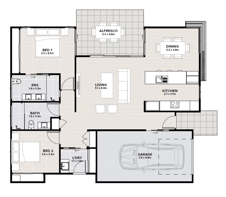 The Aspen is a thoughtfully designed two-bedroom, two-bathroom home that offers the perfect blend of comfort and functionality. The master bedroom features a private ensuite, while the second bedroom is ideal for guests, or a home office. A separate laundry adds everyday convenience, and the single garage provides secure internal access.